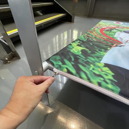 The printed fabric smoothly fits over a precision aluminium tube frame, creating a tight, wrinkle-free finish with no creases or distortions.